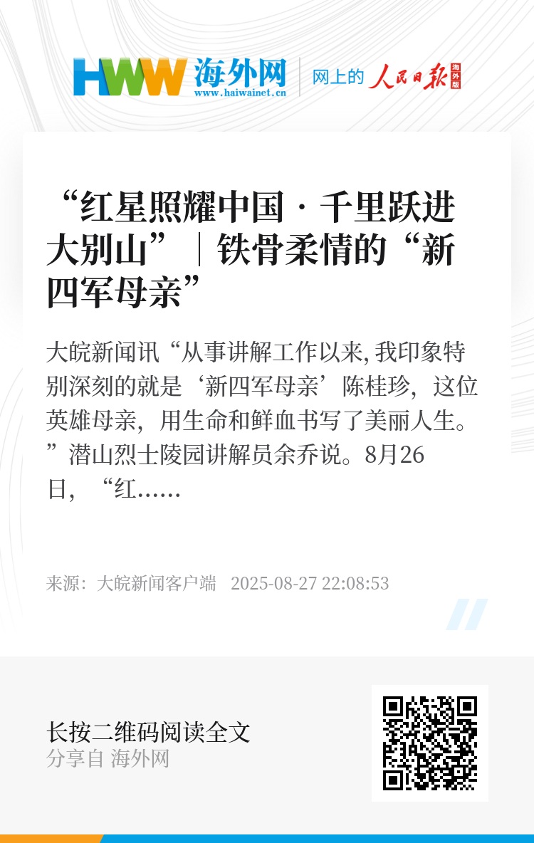 1949年,潜山县追授她“新四军母亲”的光荣称号。“这位英雄母亲的奉献精神、铁骨柔情和慈母情怀,永远值得我们铭记!”余乔说。