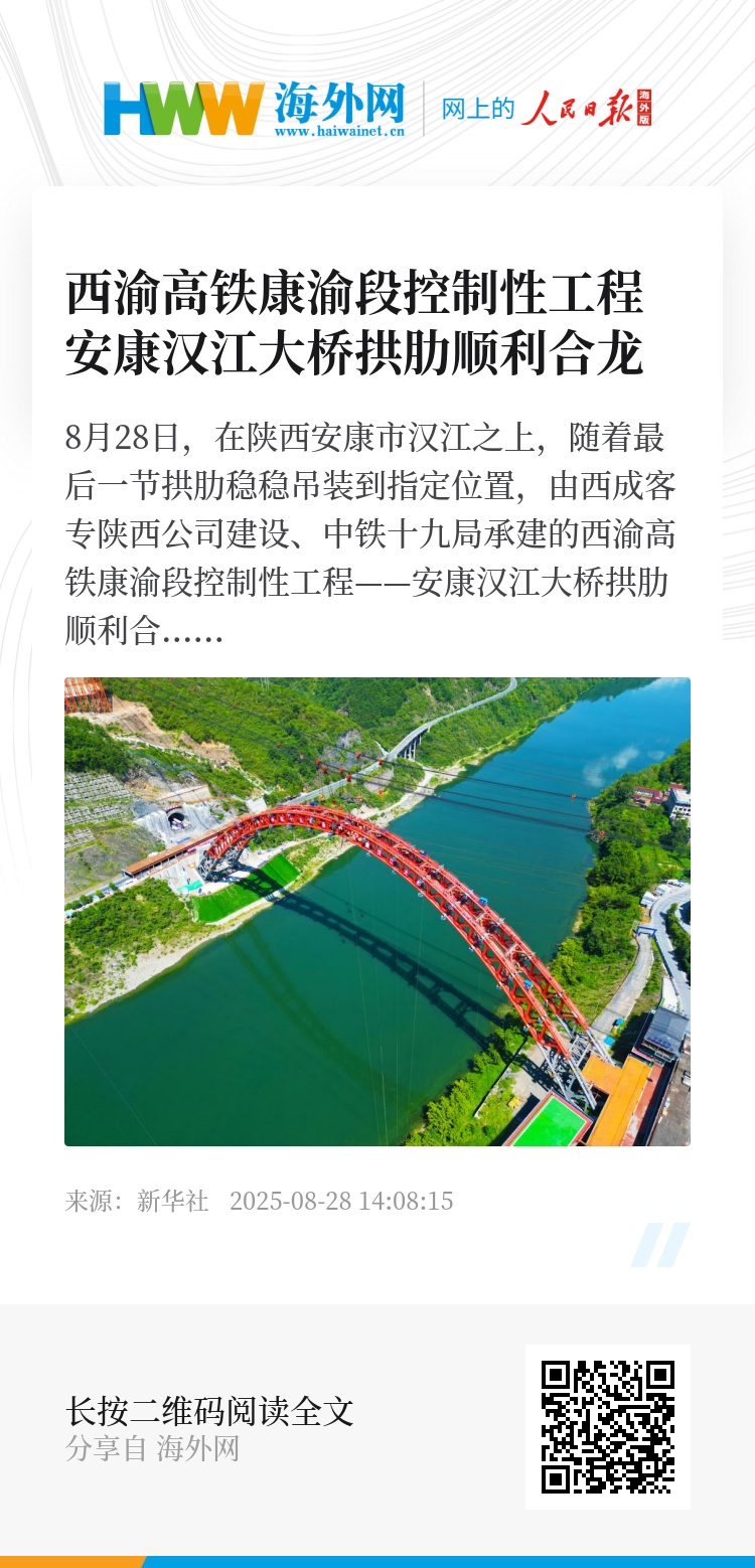 8月28日,在陕西安康市汉江之上,随着最后一节拱肋稳稳吊装到指定位置,由西成客专陕西公司建设、中铁十九局承建的西渝高铁康渝段控制性工程——安康汉江大桥拱肋顺利合龙,标志着西渝高铁康渝段桥梁工程建设取得重要进展。