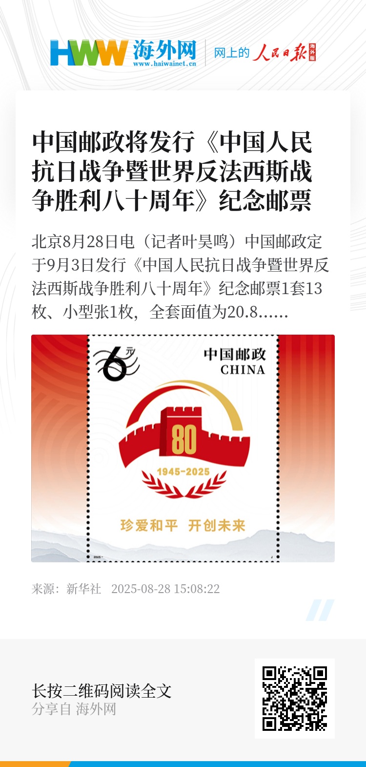 新华社北京8月28日电(记者叶昊鸣)中国邮政定于9月3日发行《中国人民抗日战争暨世界反法西斯战争胜利八十周年》纪念邮票1套13枚、小型张1枚,全套面值为20.8元。邮票计划发行数量为600万套、小型张为500万枚。