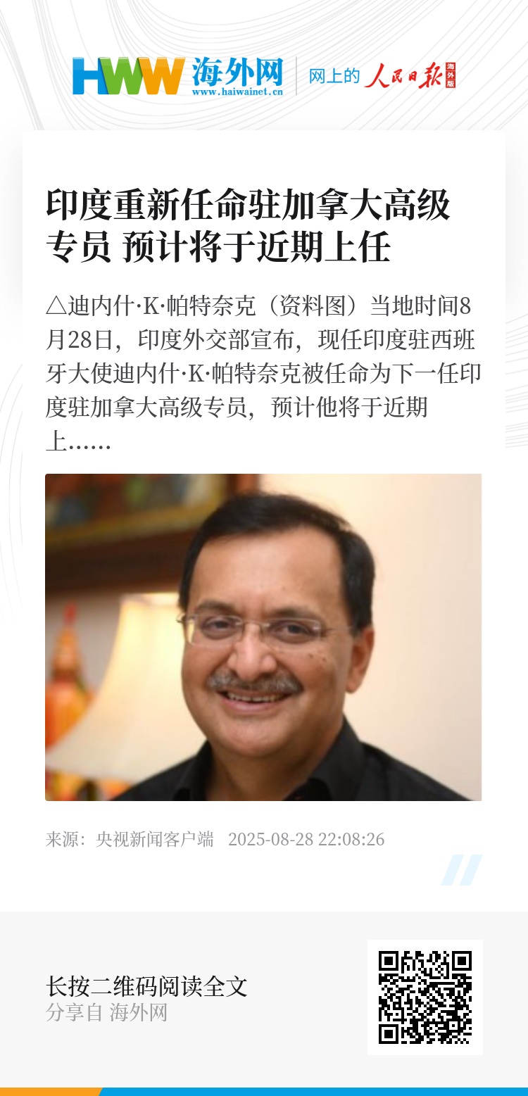 当地时间8月28日,印度外交部宣布,现任印度驻西班牙大使迪内什·K·帕特奈克被任命为下一任印度驻加拿大高级专员,预计他将于近期上任。