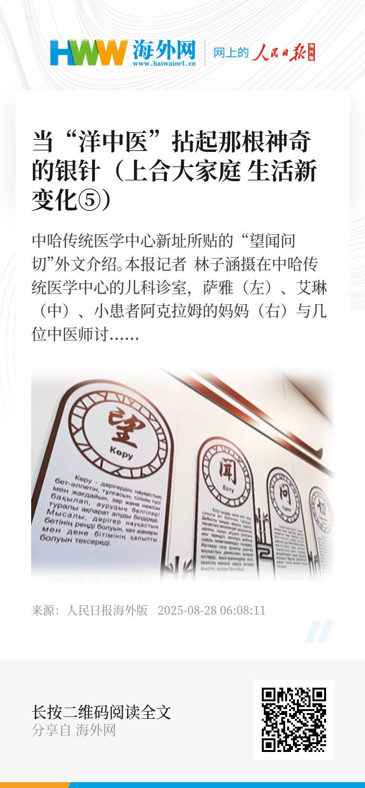 像阿克拉姆与劳珊一样的患者还有许多。中哈传统医学中心2023年5月10日开诊,至2025年8月中旬,累计服务患者4.6万余人次。每日平均接诊量超过200人次。目前,中心接诊的患者中约80%来自哈萨克斯坦本地或周边国家,同时也为在哈华侨华人、中资企业员工提供中医药服务。