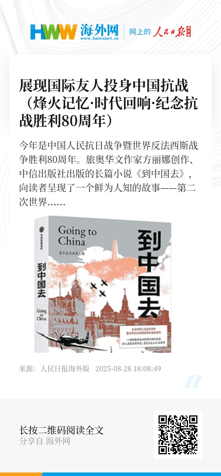 今年是中国人民抗日战争暨世界反法西斯战争胜利80周年。旅奥华文作家方丽娜创作、中信出版社出版的长篇小说《到中国去》,向读者呈现了一个鲜为人知的故事——第二次世界大战期间,奥地利医生雅各布·罗森菲尔德(中文名罗生特)和理查德·傅莱为逃离纳粹迫害,在时任中国外交官何凤山的帮助下从维也纳逃往上海,继而奔赴中国各地投身抗战。小说以两位真实人物为原型,从国际友人的视角重述1939年至1949年间中国抗战与革命的峥嵘岁月,再现了中国人民在世界反法西斯战争中艰苦卓绝的抗争,为我们走近抗战历史提供了独特视角。