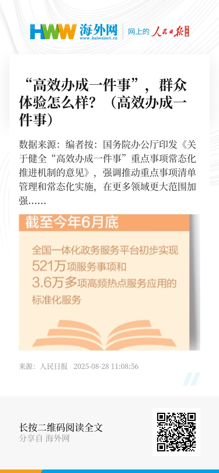 编者按:国务院办公厅印发《关于健全“高效办成一件事”重点事项常态化推进机制的意见》,强调推动重点事项清单管理和常态化实施,在更多领域更大范围加强部门协同和服务集成。