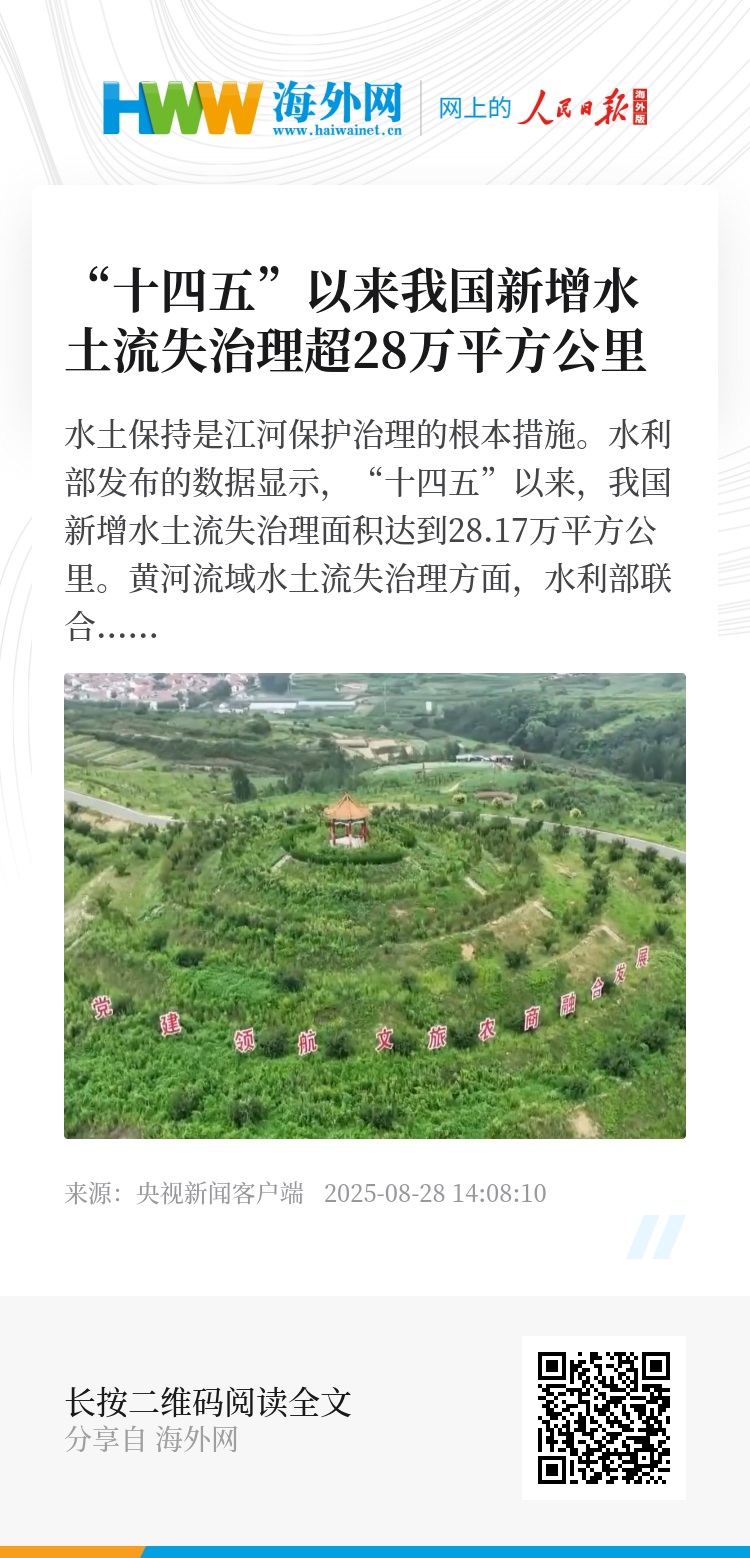 水土保持是江河保护治理的根本措施。水利部发布的数据显示,“十四五”以来,我国新增水土流失治理面积达到28.17万平方公里。
