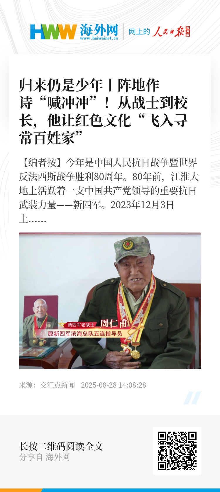 时光悠悠,曾经豪情满怀的新四军战士,变成响水县老百姓口中的“老周爹”。再忆烽火岁月,老人心中有感慨、有光荣,更多的还有对新时代青年的期待。“其实,爱国不只轰轰烈烈,还有纯纯粹粹。青年人要在中国特色社会主义的青春赛道上奋力跑出最好的成绩!”