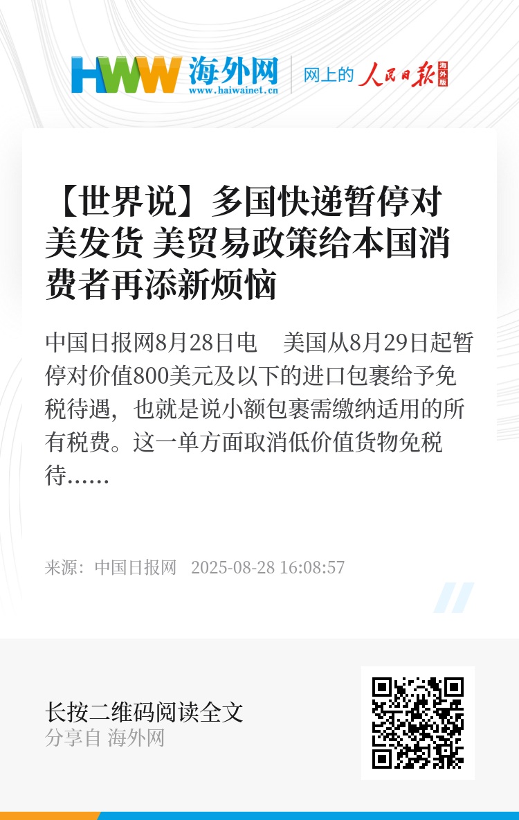 中国日报网8月28日电 美国从8月29日起暂停对价值800美元及以下的进口包裹给予免税待遇,也就是说小额包裹需缴纳适用的所有税费。这一单方面取消低价值货物免税待遇的做法,正引发跨境物流和小企业的连锁反应,也给美国消费者带来新的烦恼。