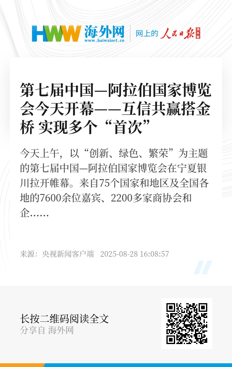 今天上午,以“创新、绿色、繁荣”为主题的第七届中国—阿拉伯国家博览会在宁夏银川拉开帷幕。来自75个国家和地区及全国各地的7600余位嘉宾、2200多家商协会和企业代表参会,充分展现了中阿博览会作为中阿共建“一带一路”重要平台的吸引力和影响力。