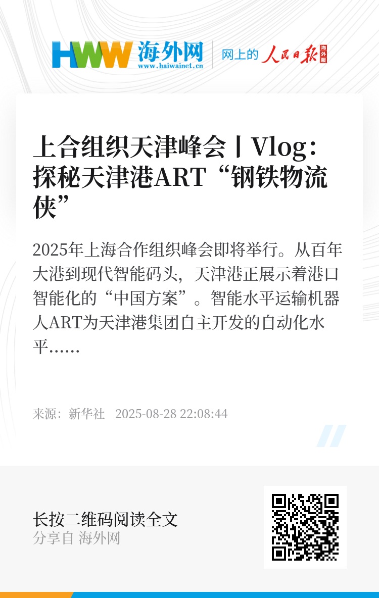 2025年上海合作组织峰会即将举行。从百年大港到现代智能码头,天津港正展示着港口智能化的“中国方案”。智能水平运输机器人ART为天津港集团自主开发的自动化水平运输设备,可与岸桥、轨道桥和充电桩实现高效联动。目前,天津港有130余台智能水平运输机器人ART规模化运行。