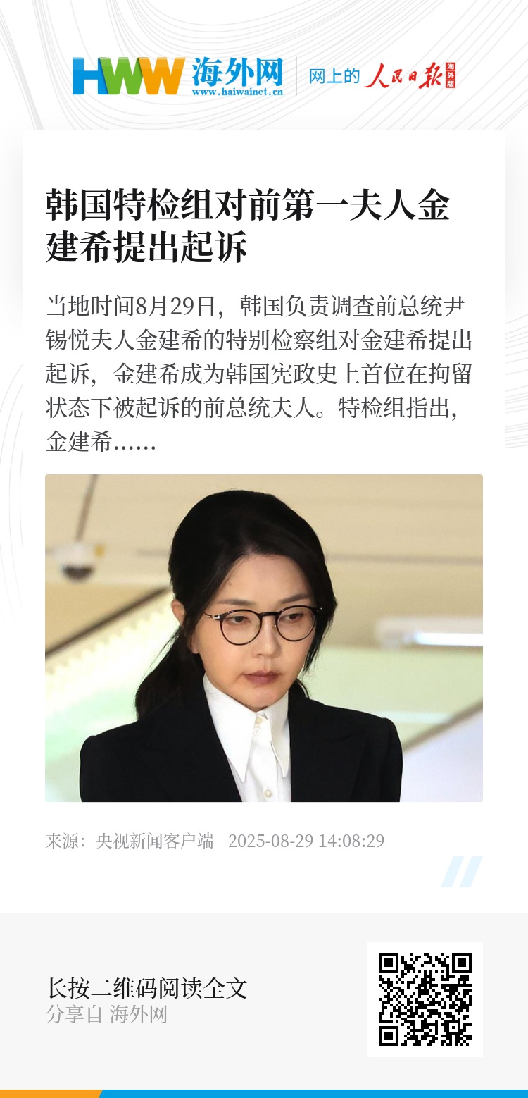 当地时间8月29日,韩国负责调查前总统尹锡悦夫人金建希的特别检察组对金建希提出起诉,金建希成为韩国宪政史上首位在拘留状态下被起诉的前总统夫人。