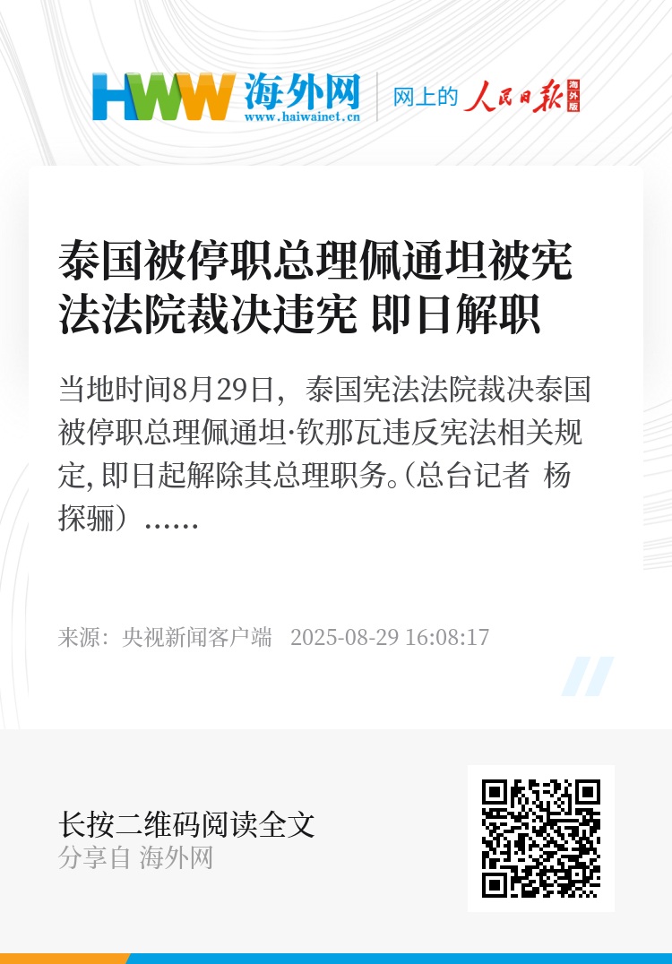 当地时间8月29日,泰国宪法法院裁决泰国被停职总理佩通坦·钦那瓦违反宪法相关规定,即日起解除其总理职务。(总台记者 杨探骊)