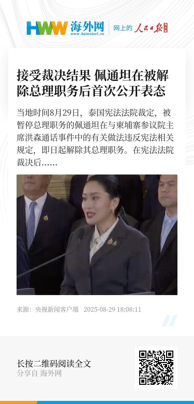 据泰国媒体此前报道,如果裁决佩通坦被正式解职,泰国政府将面临重组或触发提前大选。(总台记者 杨探骊)