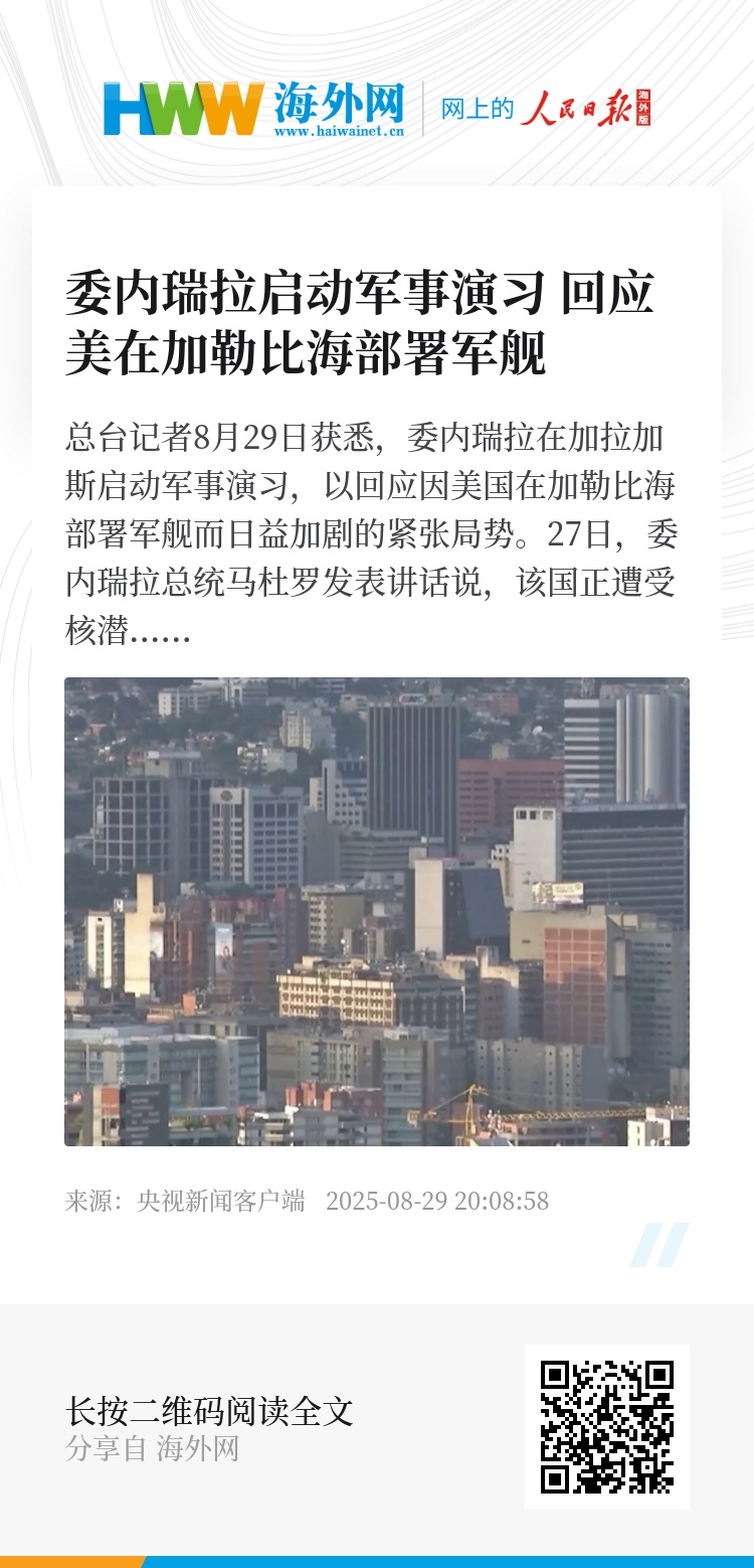 总台记者8月29日获悉,委内瑞拉在加拉加斯启动军事演习,以回应因美国在加勒比海部署军舰而日益加剧的紧张局势。