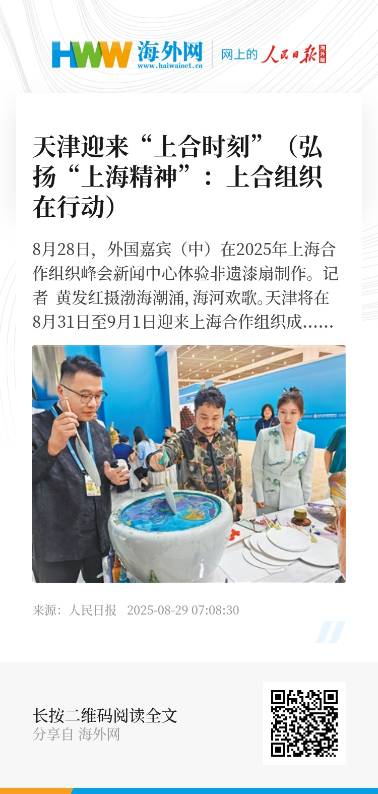 8月28日,2025年上海合作组织峰会新闻中心正式开放运营。新闻中心包含综合服务区、新闻发布区、科技文化互动展示区等八大主要功能区。在科技文化互动展示区,沉浸式裸眼3D大屏将上合组织成员国的风景名胜展现在眼前,AI数字人快速生成多场景即时播报,榫卯、漆扇、曾氏华服、泥人张、杨柳青年画等非物质文化遗产绽放光彩……创意新颖、内容丰富的展示吸引大家参观体验。