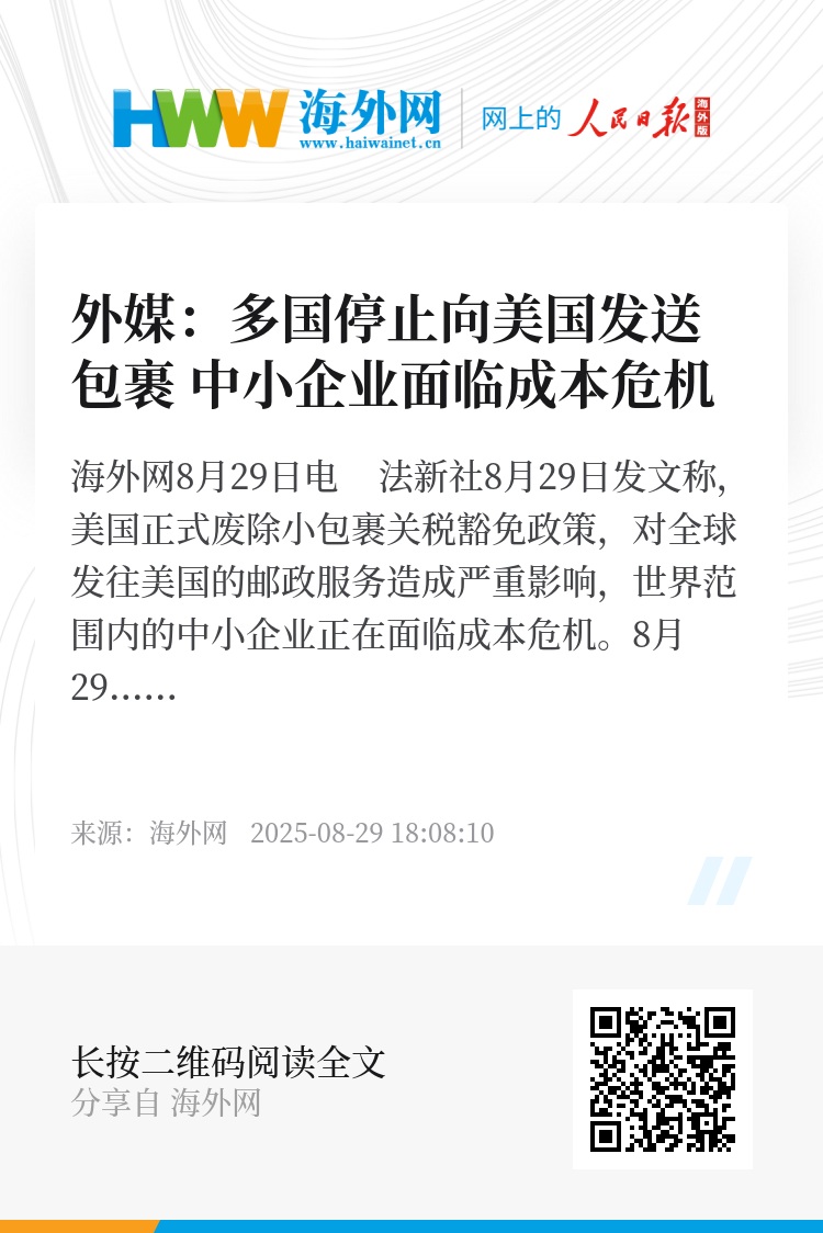 海外网8月29日电 法新社8月29日发文称,美国正式废除小包裹关税豁免政策,对全球发往美国的邮政服务造成严重影响,世界范围内的中小企业正在面临成本危机。