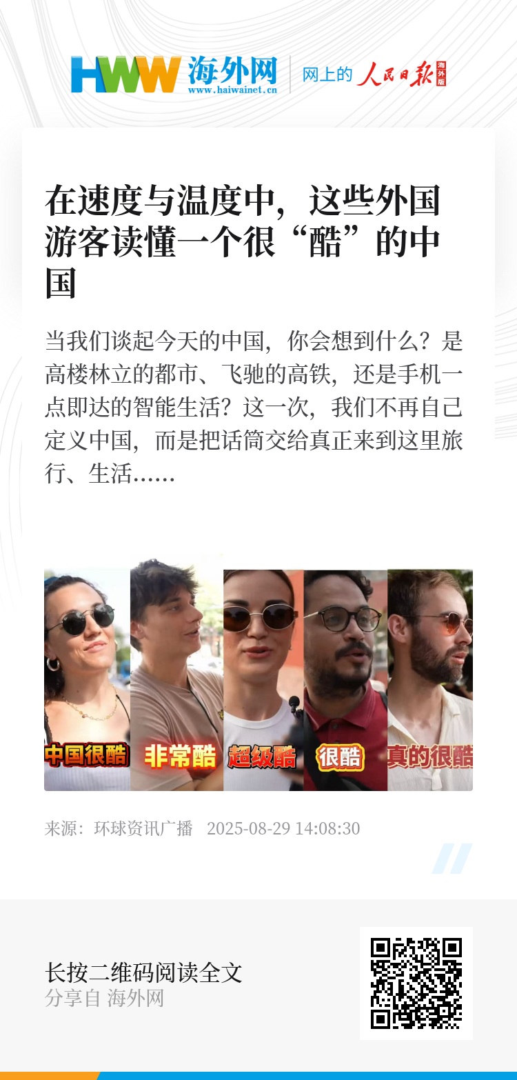正如这些外国友人所言,中国很“酷”。酷在它昼夜不停的脚步,酷在它无微不至的科技,酷在它秩序中的善意,更酷在它那份面向未来、与世界共进的胸怀。而这些来自世界各地的声音,让我们看见一个更立体、更动人的中国。