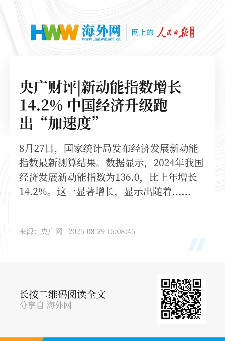 8月27日,国家统计局发布经济发展新动能指数最新测算结果。数据显示,2024年我国经济发展新动能指数为136.0,比上年增长14.2%。这一显著增长,显示出随着中国经济转型升级、新质生产力茁壮成长,中国经济新动能跑出“加速度”。
