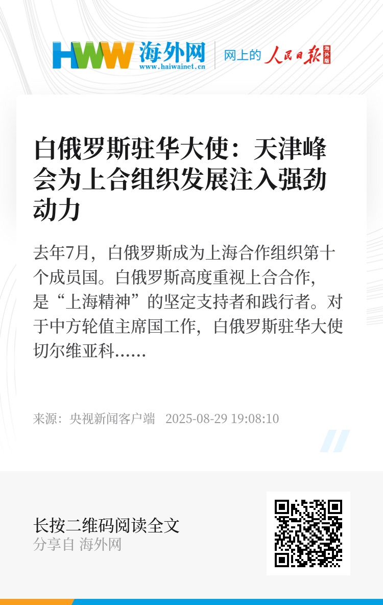 去年7月,白俄罗斯成为上海合作组织第十个成员国。白俄罗斯高度重视上合合作,是“上海精神”的坚定支持者和践行者。对于中方轮值主席国工作,白俄罗斯驻华大使切尔维亚科夫给予最高评价。他表示,即将举行的天津峰会意义重大,将为上合组织发展注入强劲动力。