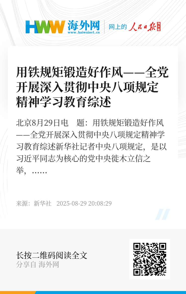新华社北京8月29日电 题:用铁规矩锻造好作风——全党开展深入贯彻中央八项规定精神学习教育综述