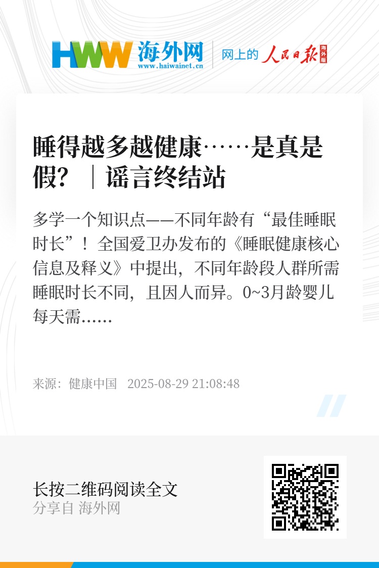 全国爱卫办发布的《睡眠健康核心信息及释义》中提出,不同年龄段人群所需睡眠时长不同,且因人而异。