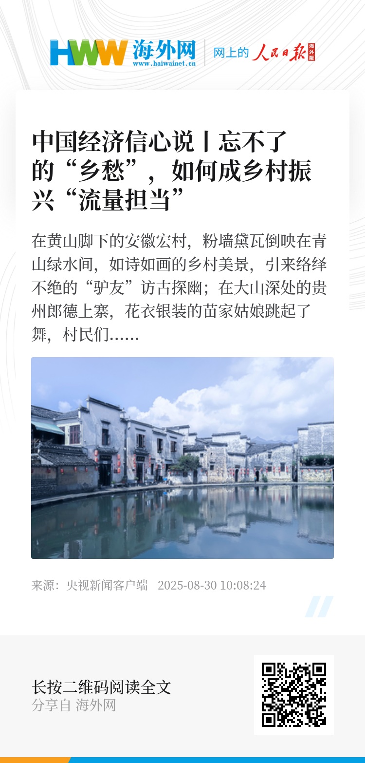 在黄山脚下的安徽宏村,粉墙黛瓦倒映在青山绿水间,如诗如画的乡村美景,引来络绎不绝的“驴友”访古探幽;在大山深处的贵州郎德上寨,花衣银装的苗家姑娘跳起了舞,村民们敲铜鼓、吹芦笙、唱酒歌,笑迎八方宾朋……住房和城乡建设部数据显示,今年上半年,8155个国家级传统村落和5028个省级传统村落吸引游客超过2.93亿人次,带动消费约342.13亿元。