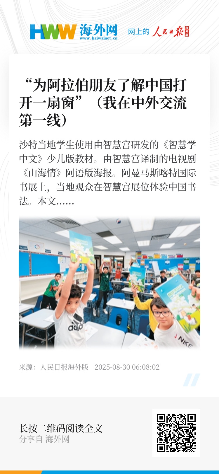 目前,智慧宫推出的全球首套面向阿拉伯国家的K12中文教材体系,沙特、阿联酋、埃及、卡塔尔、阿曼等国家中小学及高校、教育机构已经采购使用。