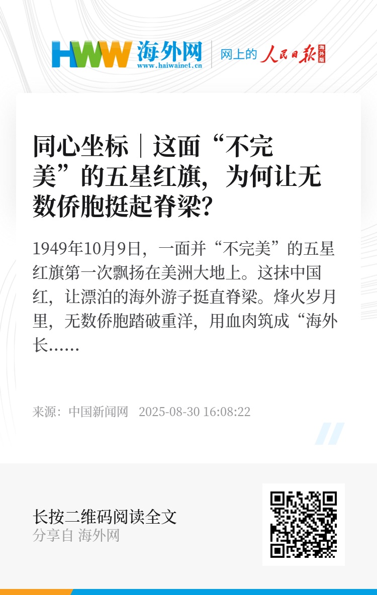 1949年10月9日,一面并“不完美”的五星红旗第一次飘扬在美洲大地上。这抹中国红,让漂泊的海外游子挺直脊梁。烽火岁月里,无数侨胞踏破重洋,用血肉筑成“海外长城”。硝烟散尽后,他们又循着新生的曙光归来,在祖国的土壤里播撒热忱。从救亡图存到复兴之路,赤子的脚步从未停歇。