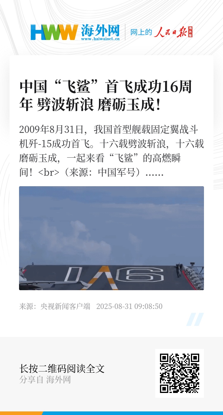 2009年8月31日,我国首型舰载固定翼战斗机歼-15成功首飞。十六载劈波斩浪,十六载磨砺玉成,一起来看“飞鲨”的高燃瞬间! (来源:中国军号)