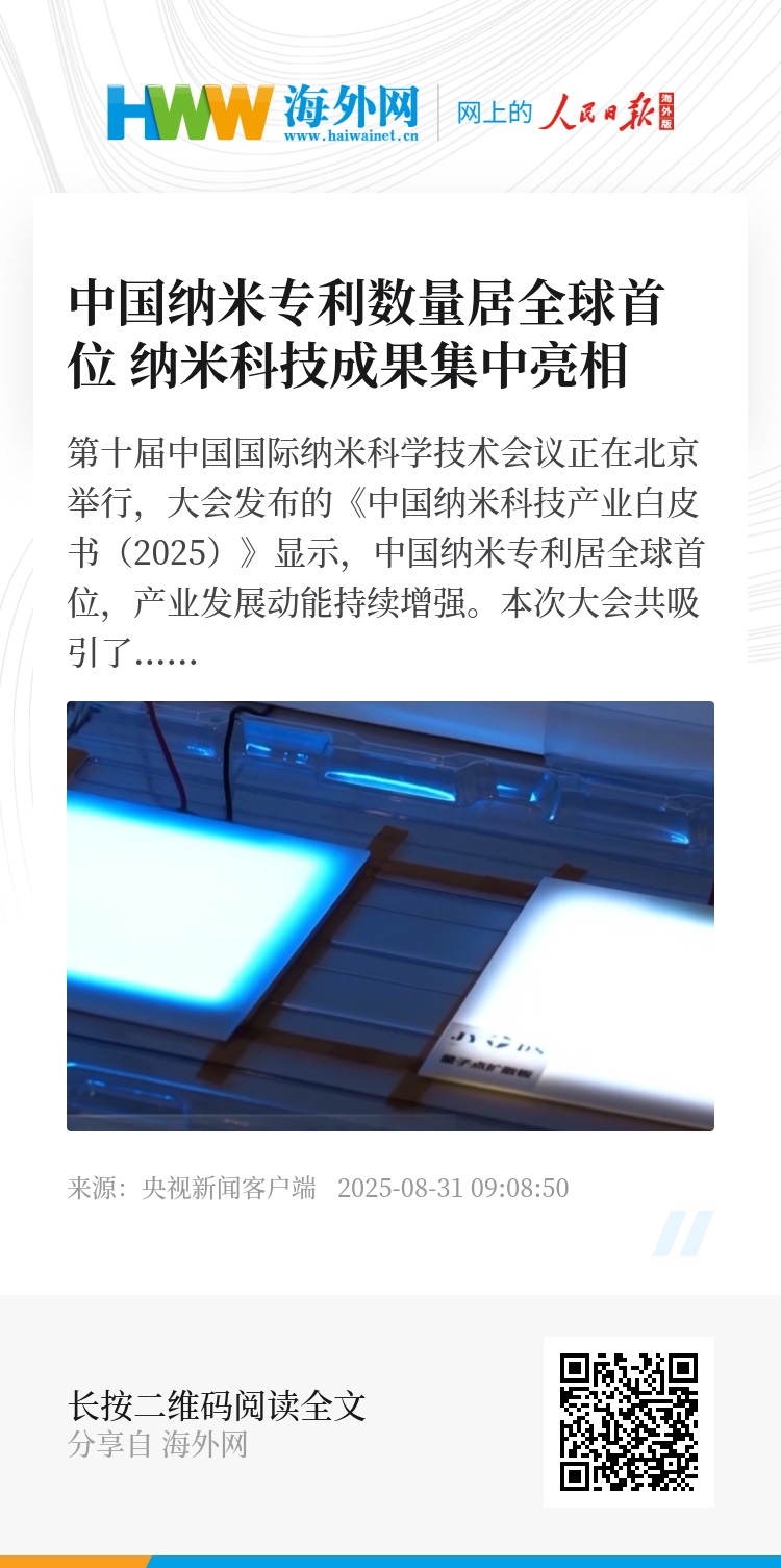 第十届中国国际纳米科学技术会议正在北京举行,大会发布的《中国纳米科技产业白皮书(2025)》显示,中国纳米专利居全球首位,产业发展动能持续增强。