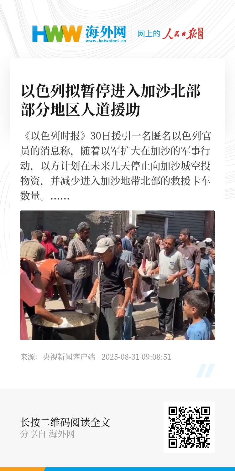 《以色列时报》30日援引一名匿名以色列官员的消息称,随着以军扩大在加沙的军事行动,以方计划在未来几天停止向加沙城空投物资,并减少进入加沙地带北部的救援卡车数量。