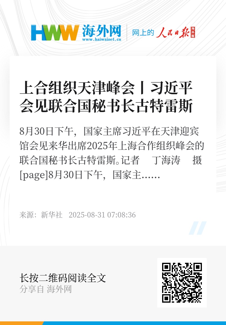 8月30日下午,国家主席习近平在天津迎宾馆会见来华出席2025年上海合作组织峰会的联合国秘书长古特雷斯。