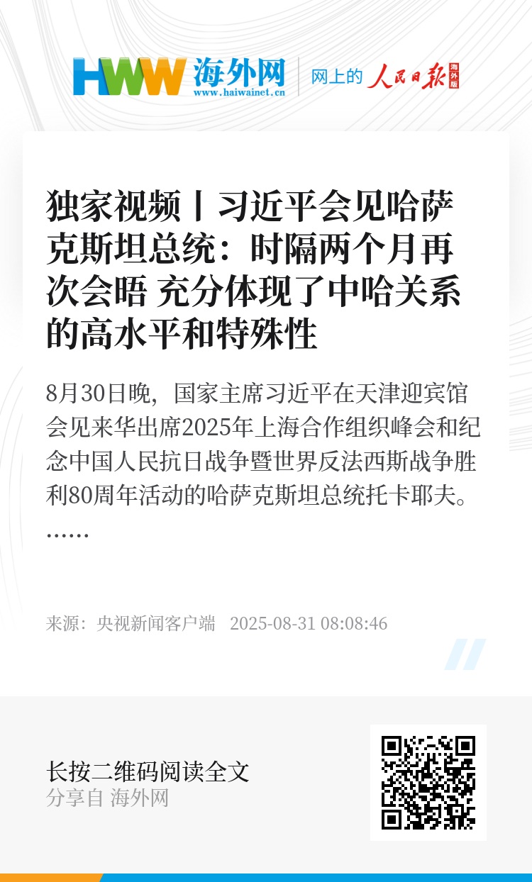 8月30日晚,国家主席习近平在天津迎宾馆会见来华出席2025年上海合作组织峰会和纪念中国人民抗日战争暨世界反法西斯战争胜利80周年活动的哈萨克斯坦总统托卡耶夫。
