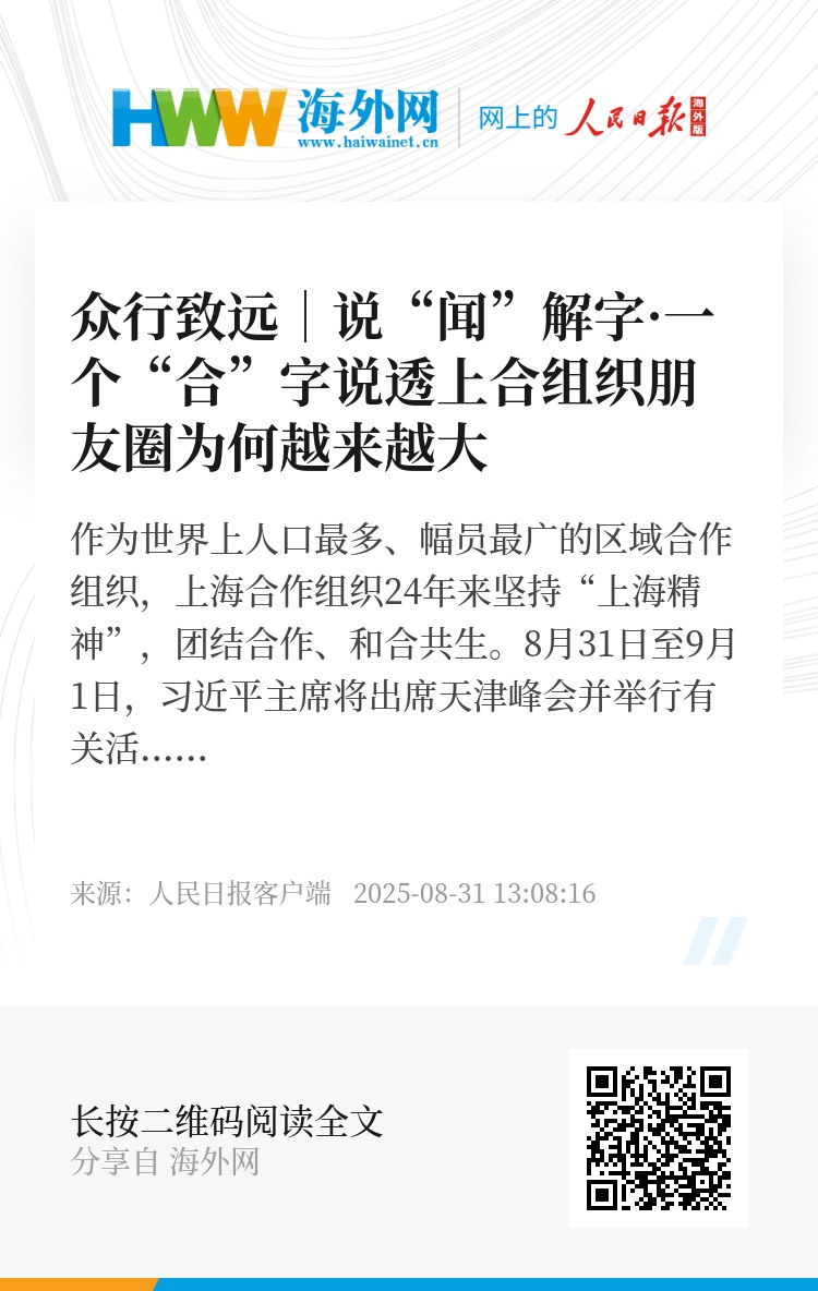 作为世界上人口最多、幅员最广的区域合作组织,上海合作组织24年来坚持“上海精神”,团结合作、和合共生。8月31日至9月1日,习近平主席将出席天津峰会并举行有关活动,让我们一起期待!