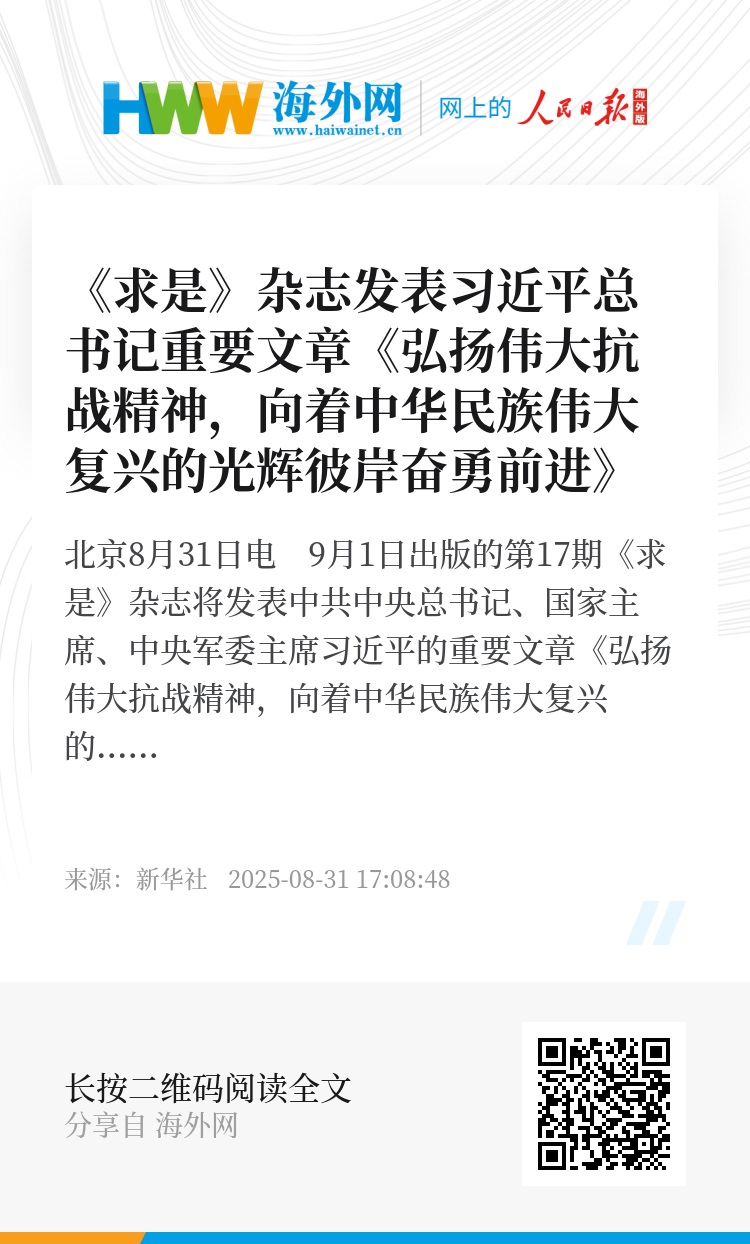新华社北京8月31日电 9月1日出版的第17期《求是》杂志将发表中共中央总书记、国家主席、中央军委主席习近平的重要文章《弘扬伟大抗战精神,向着中华民族伟大复兴的光辉彼岸奋勇前进》。这是习近平总书记2014年7月至2025年5月期间有关重要论述的节录。