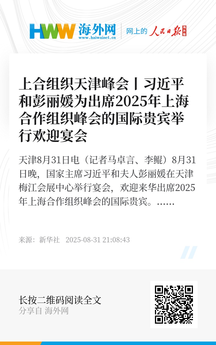 新华社天津8月31日电(记者马卓言、李鲲)8月31日晚,国家主席习近平和夫人彭丽媛在天津梅江会展中心举行宴会,欢迎来华出席2025年上海合作组织峰会的国际贵宾。