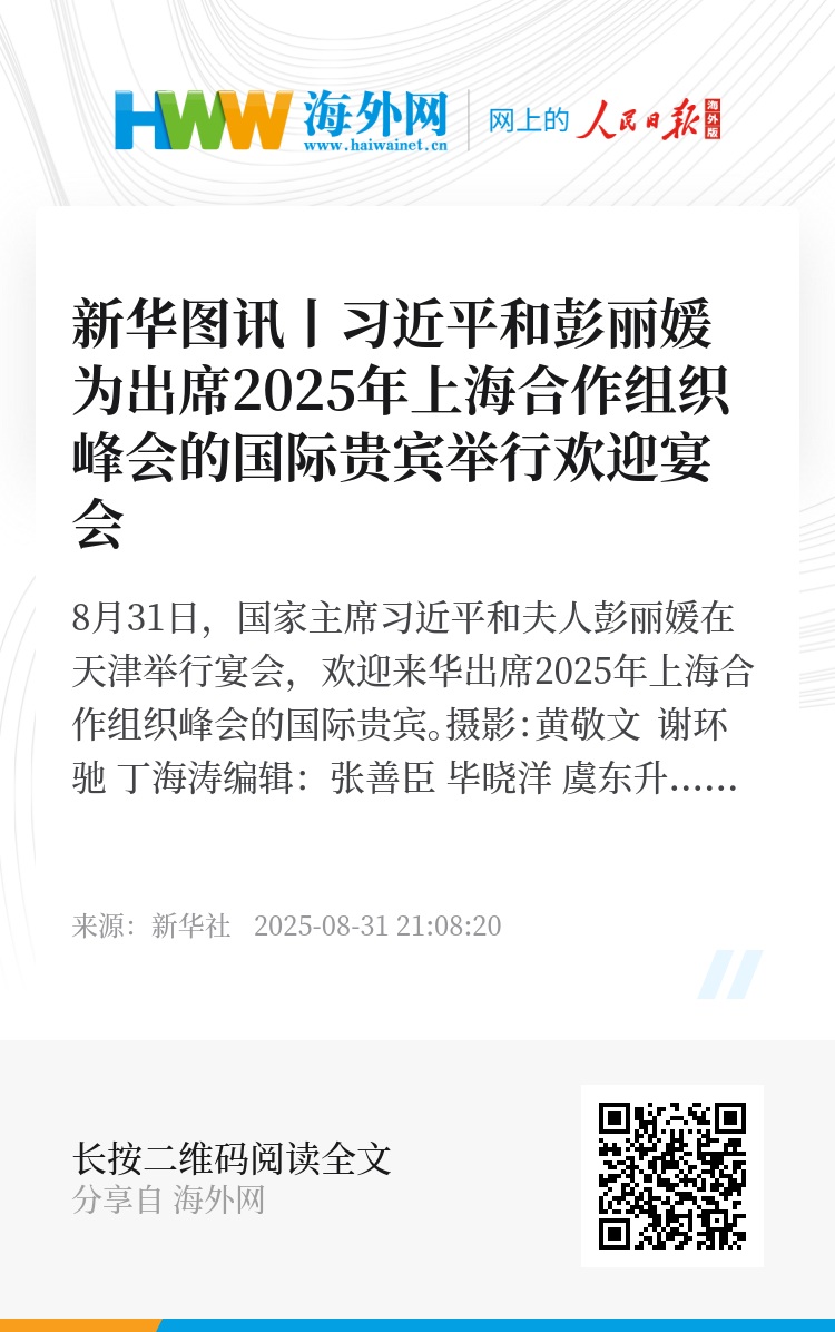 8月31日,国家主席习近平和夫人彭丽媛在天津举行宴会,欢迎来华出席2025年上海合作组织峰会的国际贵宾。