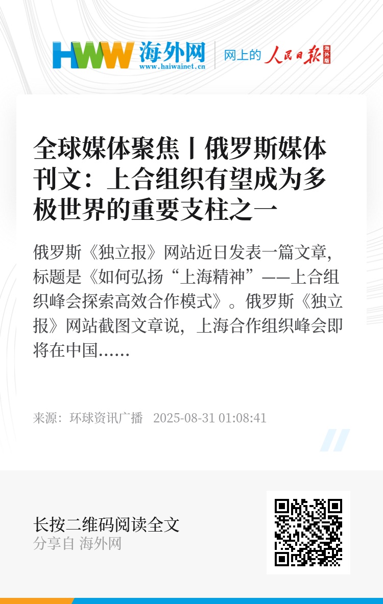 文章认为,由于成员国间存在不同优先议题,因此始终强调“和平解决分歧”的重要性。文章说,天津峰会将致力于探索更高效的合作模式。中国一直致力于弘扬“上海精神”,增强上合组织的凝聚力,提高工作效率,推动上合组织发展迈向更高水平。俄罗斯对此高度重视,因为上合组织有望成为多极世界的重要支柱之一。