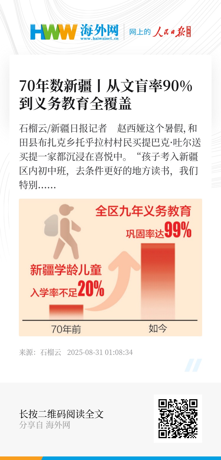 从青壮年扫盲到全覆盖控辍保学,从普及九年义务教育到迈向义务教育优质均衡发展,70年来尤其是党的十八大以来,新疆全面推进义务教育免试就近入学全覆盖,强化控辍保学属地管理职责,优先做好随迁子女、留守儿童和残疾儿童入学保障,如今,全区九年义务教育巩固率达99%,高于全国同期平均水平3.2个百分点。进城务工人员随迁子女在公办学校就读比例为99.16%,比全国同期平均水平高8.26个百分点。
