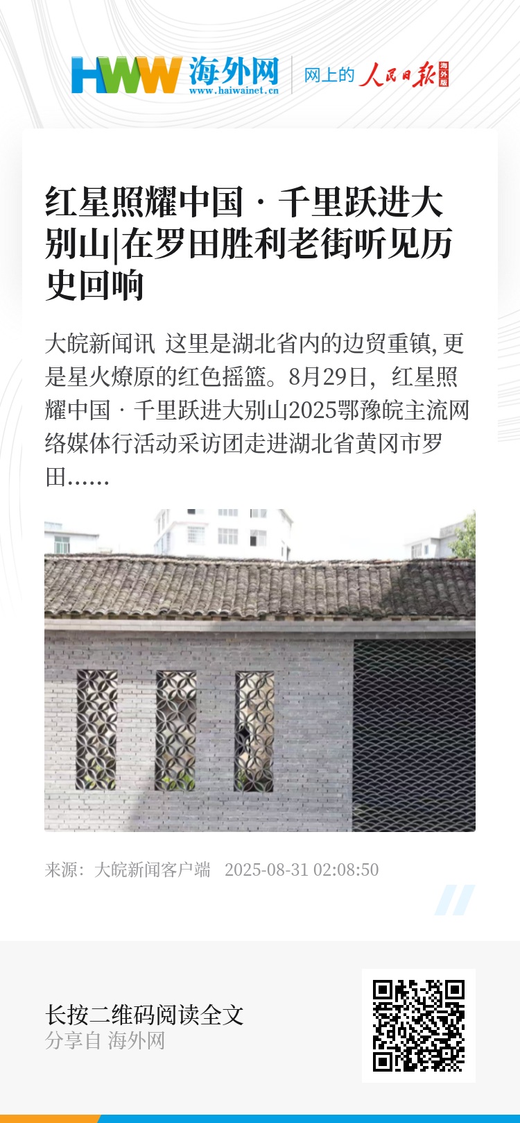 大皖新闻讯 这里是湖北省内的边贸重镇,更是星火燎原的红色摇篮。8月29日,红星照耀中国•千里跃进大别山2025鄂豫皖主流网络媒体行活动采访团走进湖北省黄冈市罗田县胜利镇。记者们漫步胜利老街,驻足金凤楼,在沧桑古建中聆听那段风雷激荡的革命岁月,感受穿越百年的理想与信仰。