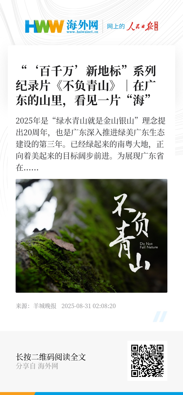 2025年是“绿水青山就是金山银山”理念提出20周年,也是广东深入推进绿美广东生态建设的第三年。已经绿起来的南粤大地,正向着美起来的目标阔步前进。为展现广东省在推进“百千万工程”过程中绿美生态与特色产业协同发展形成的新地标,羊城晚报策划推出“‘百千万’新地标”系列纪录片,用镜头定格生态之变、生态之美。