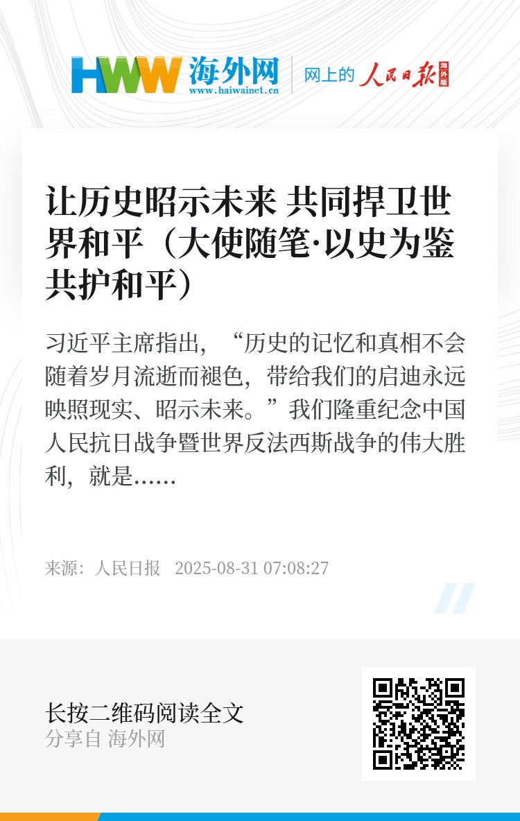 我们要铭记历史,共同捍卫世界和平。当今世界是一个多极化的世界,命运与共、休戚相关是最大现实,同舟共济、合作共赢是应对挑战的必由之路。任何国家试图像以往那样称王称霸、唯我独尊,必将遭到世界各国人民的坚决反对,任何依靠武力对外侵略扩张,最终都将失败,这是颠扑不破的历史铁律。世界各国必须共担维护和平责任,同走和平发展道路,共谋和平、共护和平、共享和平。