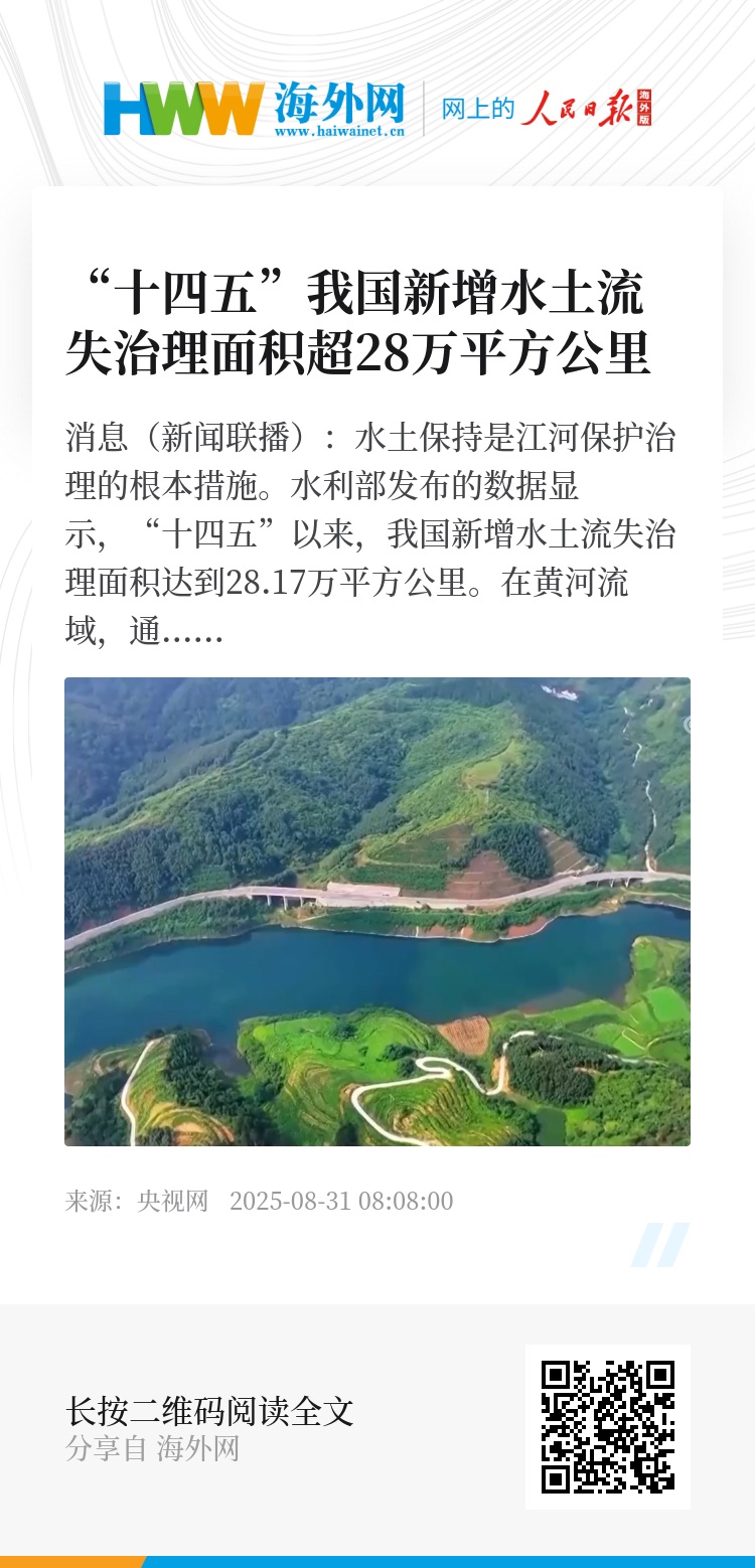 央视网消息(新闻联播):水土保持是江河保护治理的根本措施。水利部发布的数据显示,“十四五”以来,我国新增水土流失治理面积达到28.17万平方公里。