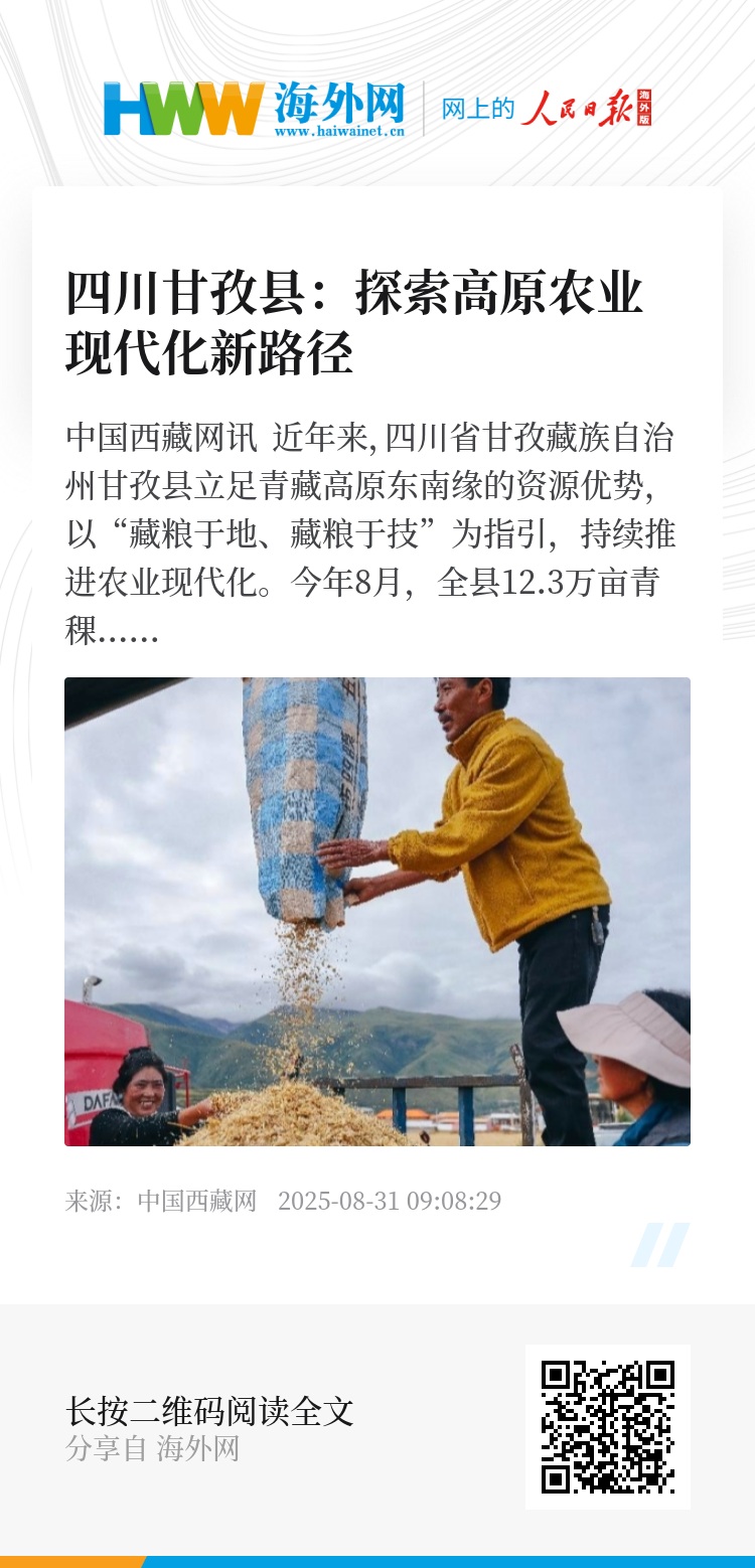 中国西藏网讯 近年来,四川省甘孜藏族自治州甘孜县立足青藏高原东南缘的资源优势,以“藏粮于地、藏粮于技”为指引,持续推进农业现代化。今年8月,全县12.3万亩青稞喜获丰收,预计总产量达27805吨,充分展现了高原特色农业的发展活力。