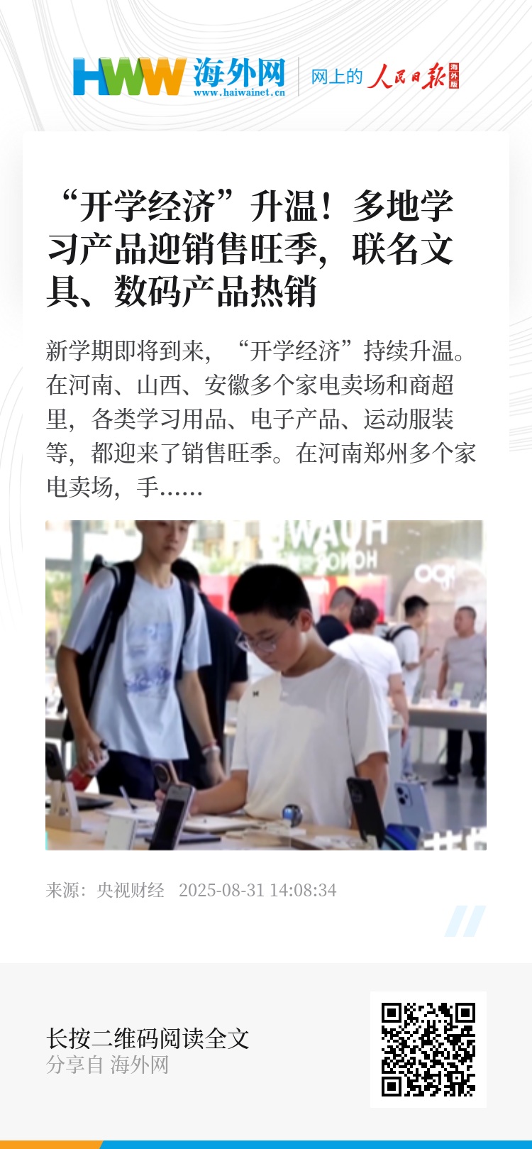 在河南郑州多个家电卖场,手机、笔记本电脑、AI智能学习机等3C产品区的消费者络绎不绝,其中有不少是家长带孩子来选购电子产品。有的商场还专门打造了集文具、电子产品、行李箱、眼镜等开学季相关产品的购物一条街,其中各种联名文具、承重较强的行李箱等产品销量增长明显。