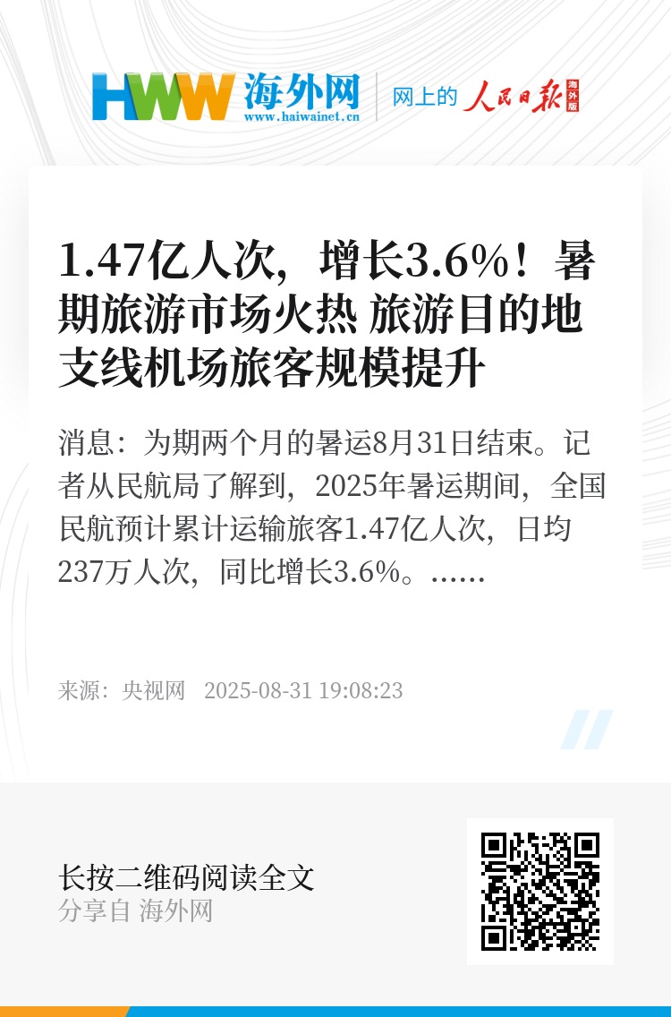 央视网消息:为期两个月的暑运8月31日结束。记者从民航局了解到,2025年暑运期间,全国民航预计累计运输旅客1.47亿人次,日均237万人次,同比增长3.6%。