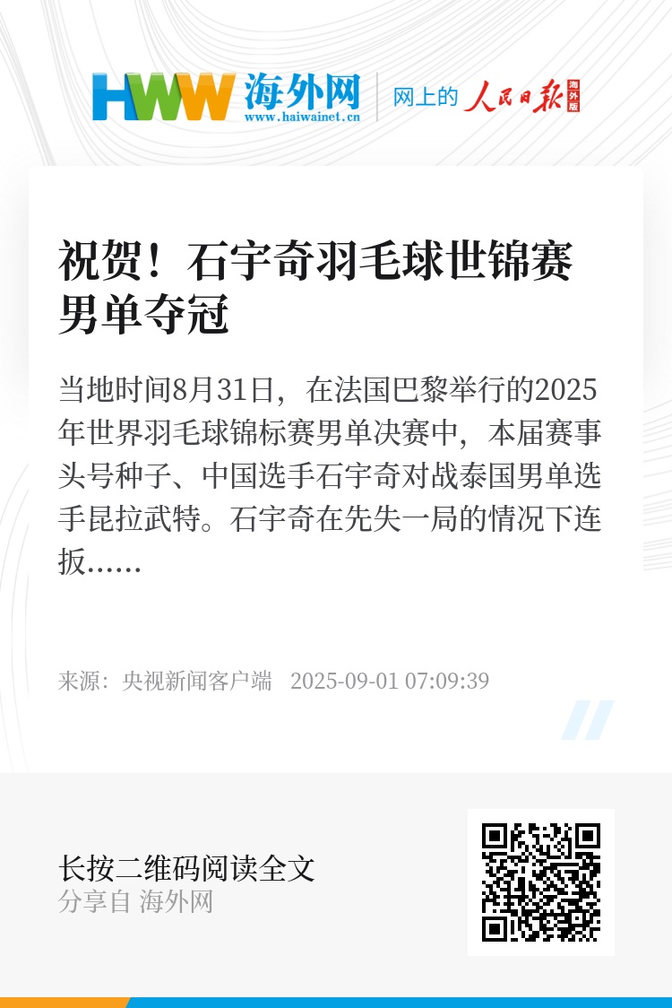 当地时间8月31日,在法国巴黎举行的2025年世界羽毛球锦标赛男单决赛中,本届赛事头号种子、中国选手石宇奇对战泰国男单选手昆拉武特。石宇奇在先失一局的情况下连扳两局,最终以总比分2比1战胜对手,获得冠军。(总台记者 朱雪松 林晖)