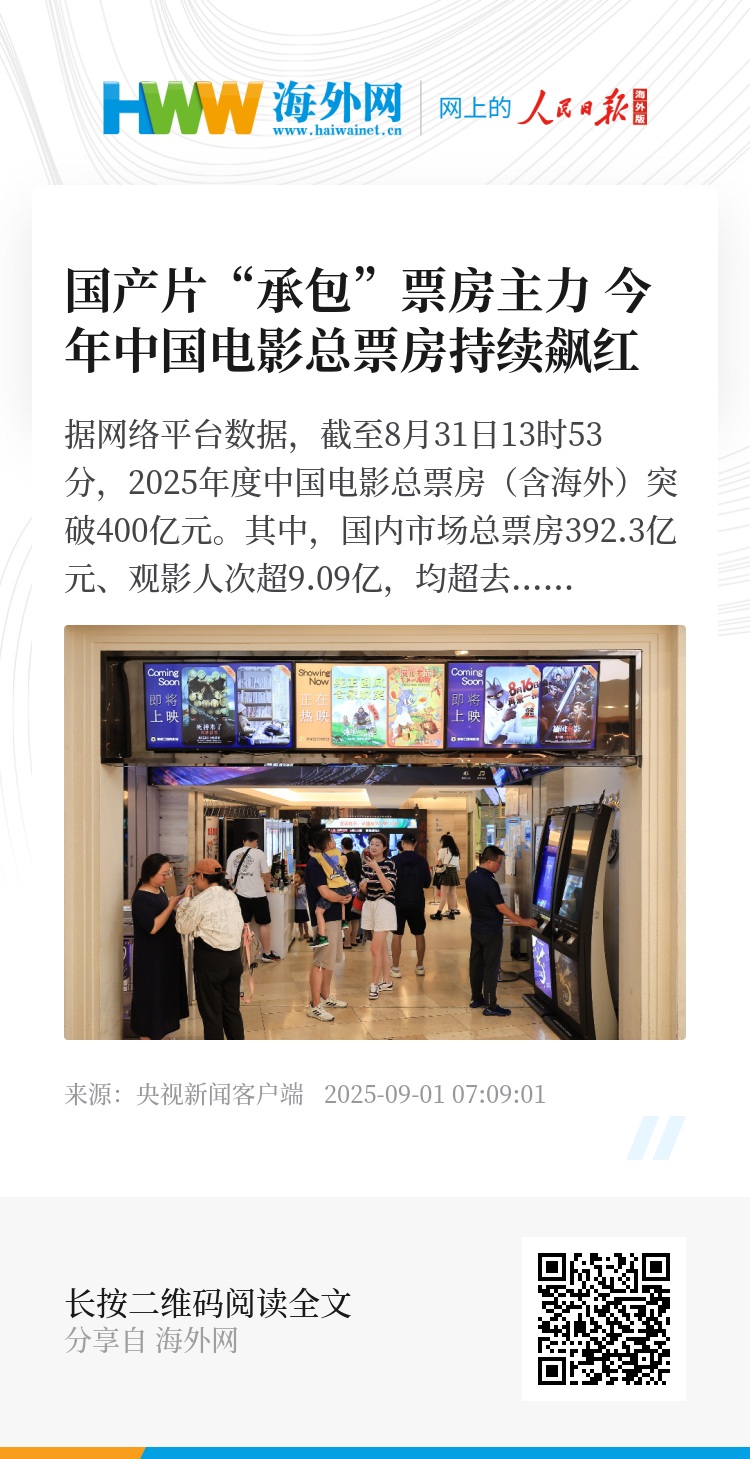 据网络平台数据,截至8月31日13时53分,2025年度中国电影总票房(含海外)突破400亿元。其中,国内市场总票房392.3亿元、观影人次超9.09亿,均超去年。今年以来,在《哪吒之魔童闹海》《南京照相馆》等影片带动下,中国电影海外市场票房折合人民币已超7.7亿元,创下多年新高。