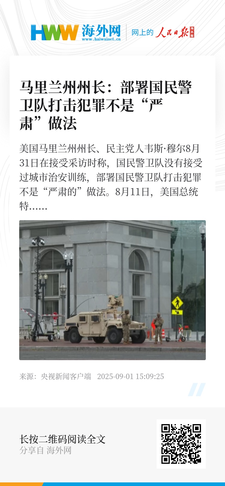 美国马里兰州州长、民主党人韦斯·穆尔8月31日在接受采访时称,国民警卫队没有接受过城市治安训练,部署国民警卫队打击犯罪不是“严肃的”做法。