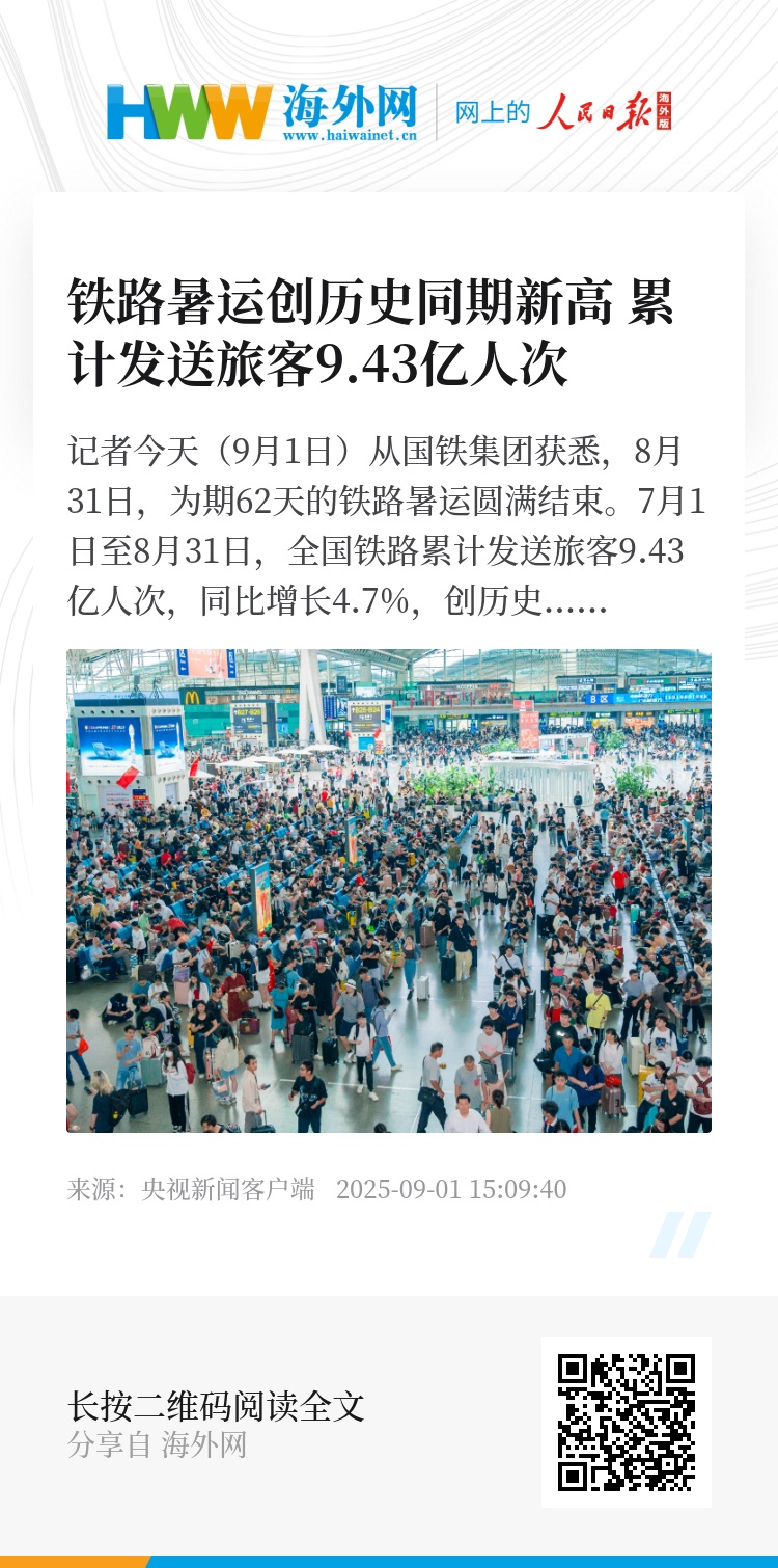 记者今天(9月1日)从国铁集团获悉,8月31日,为期62天的铁路暑运圆满结束。7月1日至8月31日,全国铁路累计发送旅客9.43亿人次,同比增长4.7%,创历史同期新高;国家铁路累计发送货物7.02亿吨,同比增长4.8%,铁路运输安全平稳有序。
