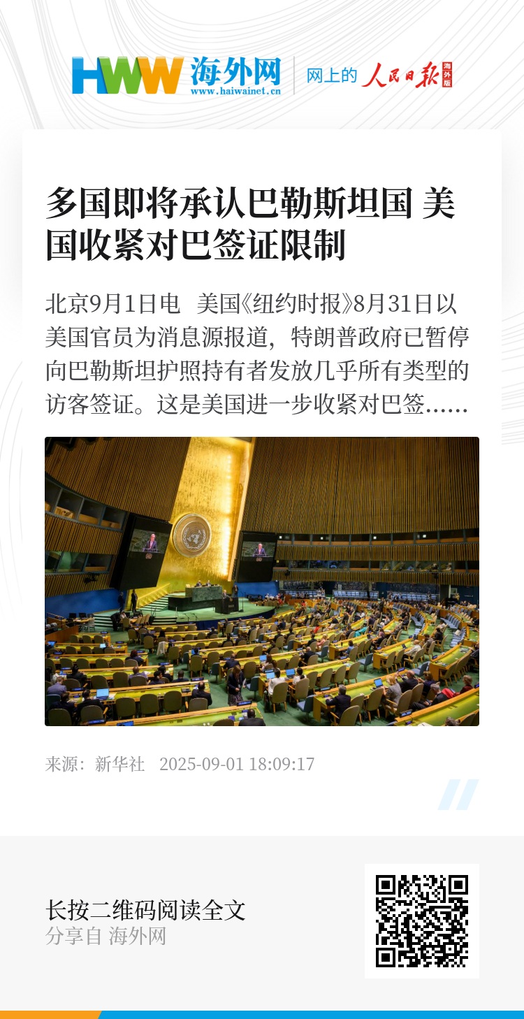 新华社北京9月1日电 美国《纽约时报》8月31日以美国官员为消息源报道,特朗普政府已暂停向巴勒斯坦护照持有者发放几乎所有类型的访客签证。这是美国进一步收紧对巴签证的最新举措,此前“拒签”对象包括巴勒斯坦国总统阿巴斯。