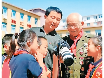 姚振锋(左四)与老兵来到学校开展爱国主义教育活动。厉飞摄